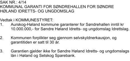 KOMMUNAL GARANTI FOR SØNDREHALLEN FOR SØNDRE HØLAND IDRETTS- OG