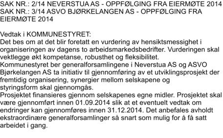 Kommunestyret ber generalforsamlingene i Neverstua AS og ASVO Bjørkelangen AS ta initiativ til