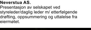 Neverstua AS. Presentasjon av selskapet ved styreleder/daglig leder m/ etterfølgende